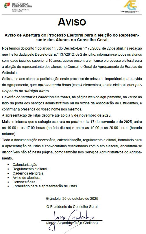 Aviso de Abertura do Processo Eleitoral para a eleição do Representan-te dos Alunos no Conselho Geral